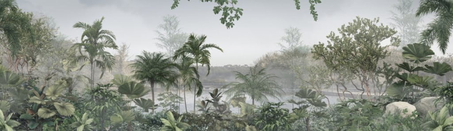 Dacă vă plac motivele exotice și doriți să vă simțiți ca în vacanță în apartamentul dumneavoastră, această pictură murală este o alegere foarte bună. Motivul unui lac ascuns într-o junglă tropicală, în culori aplicate și subtile, este ceea ce face această pictură murală atât de neobișnuită.