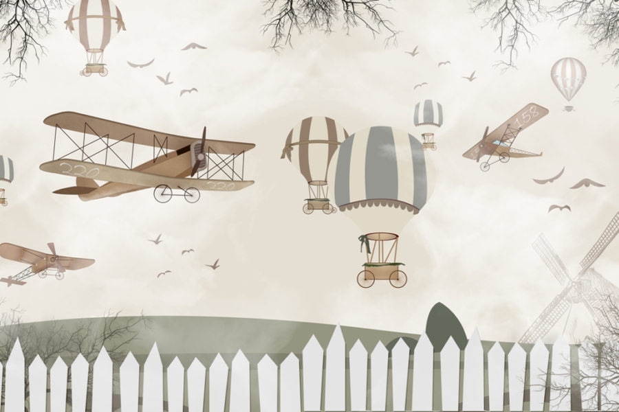 Išskirtinis oro balionų ir lėktuvų motyvas danguje – puiki idėja sukurti įdomiai atrodantį vaikų kambarį. Toks kambarys turi būti jaukus ir kartu įdomus. Tai padės užtikrinti, kad, viena vertus, vaikas jaustųsi patogiai tokiame kambaryje ir, kita vertus, turėtų įdomią erdvę. Be to, sieninė tapyba buvo sukurta naudojant aukštos kokybės medžiagas, kad būtų užtikrintas tinkamas ilgaamžiškumas.