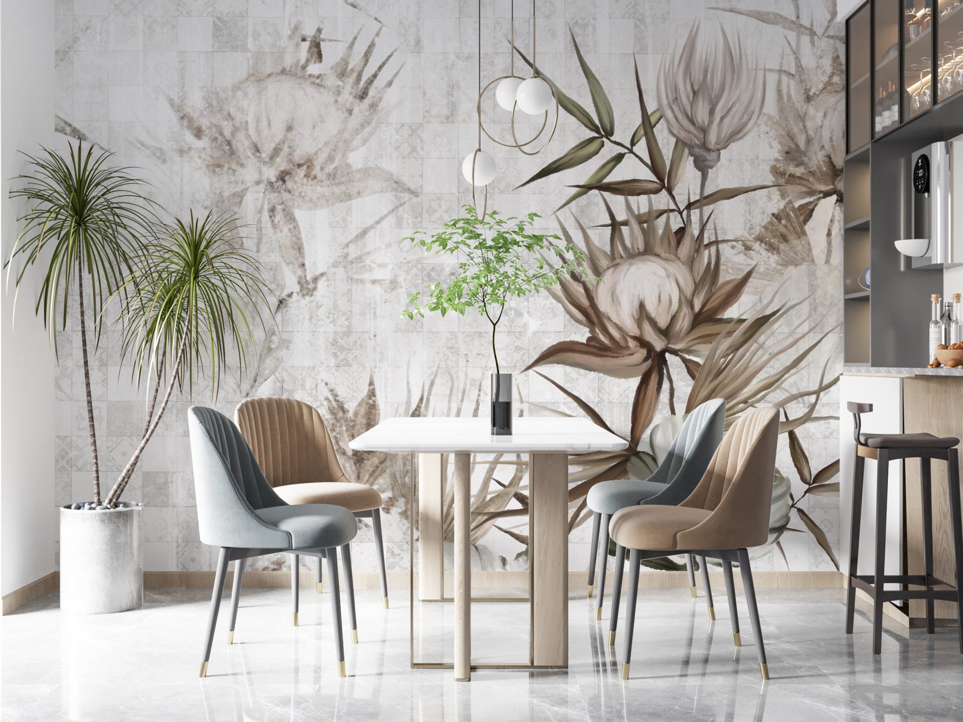 Florile pe un fundal decolorat de tablă de cărămiziu reprezintă o combinație de clasic și modern. Acest model neobișnuit va atrage privirea și va adăuga caracter camerei. Pictura murală este realizată din materiale de înaltă calitate, ceea ce garantează durabilitate și culori intense.