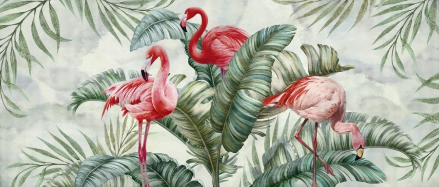 Această frumoasă pictură murală înfățișează flamingo exotici, înconjurați de o vegetație verde luxuriantă. Cu culorile sale intense și motivele sale detaliate, această decorațiune va conferi oricărei încăperi un aer exotic și o expresie originală.