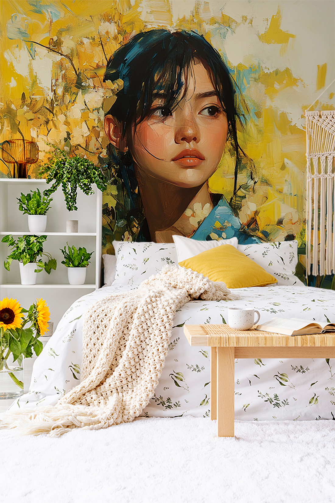 Cufundați-vă într-o atmosferă subtilă de pace și reflecție cu această pictură murală unică care înfățișează o fată privind în depărtare. Privirea ei este plină de vise și mistere care trezesc imaginația și vă inspiră să vă opriți pentru o clipă.