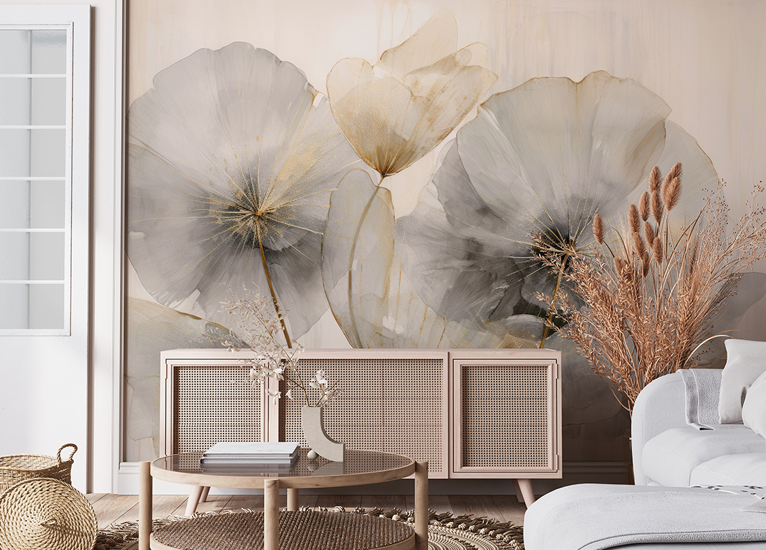 Mit einer gedämpften Farbpalette aus Beige, Grau und gebrochenem Weiß passt die Fototapete wunderbar zu natürlichen Materialien und klassischen Interieurs. Es ist ideal für das Wohnzimmer, das Schlafzimmer oder das elegante Arbeitszimmer und schafft einen Raum voller Licht, Atem und stilvoller Schlichtheit.